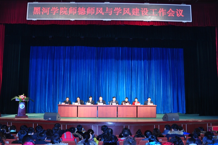 本网讯(记者 姜辉)为进一步加强我院教师思想道德建设,提高师德修养,以良好的师德师风带动学风建设,营造良好的育人氛围,12月9日下午,黑河学院师德师风建设与学风建设工作会议在学院礼堂隆重召开,学院党委书记曲伟建、院长贯昌福、党委副书记孙作勤出席会议并作重要讲话。