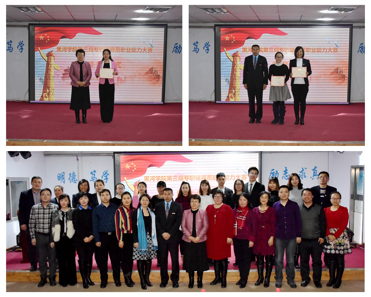 颁奖典礼上,杨宏副书记对比赛的成功举办表示祝贺。她指出,本次比赛准备充分、亮点突出,在笔试环节特邀2016年黑龙江省高校辅导员职业能力大赛一等奖获得者黑龙江大学马瑞雪出题,并按照省赛要求新增添谈心谈话比赛环节,使比赛更加规范、科学、合理,达到了以赛促学、以赛促培、以赛促建的目的。希望全体辅导员以本次大赛为契机,进一步强化职业认同,牢固树立职业理想,进一步增强工作的责任感和使命感,珍惜荣誉、奋发有为,不断提升学生管理工作水平,为学校学生工作发展作出更新、更大的贡献。