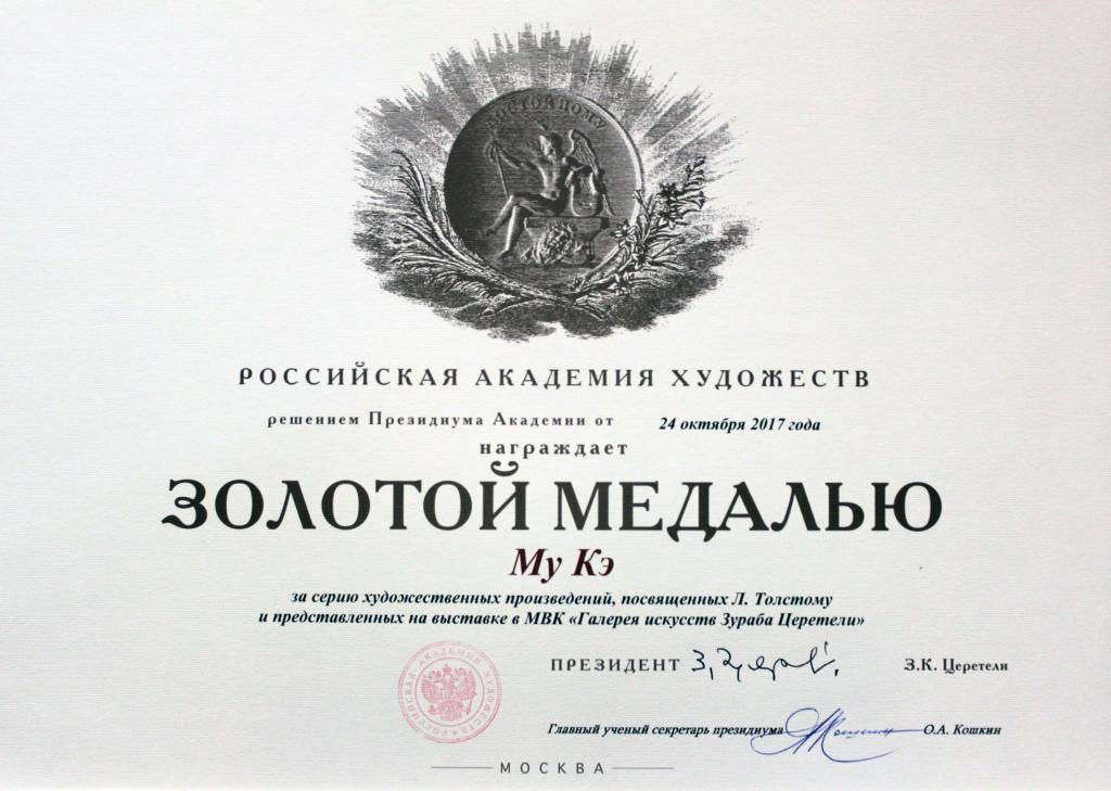 《纪念列夫·托尔斯泰——战争与和平》系列作品于今年4月在莫斯科展出,经过俄罗斯艺术科学院主席专家团的评审,最终获得这一代表俄罗斯艺术科学院最高荣誉的奖项。俄罗斯联邦艺术科学院院长祖拉布·采列捷利为牟克颁发俄罗斯联邦艺术科学院金质奖章和证书。