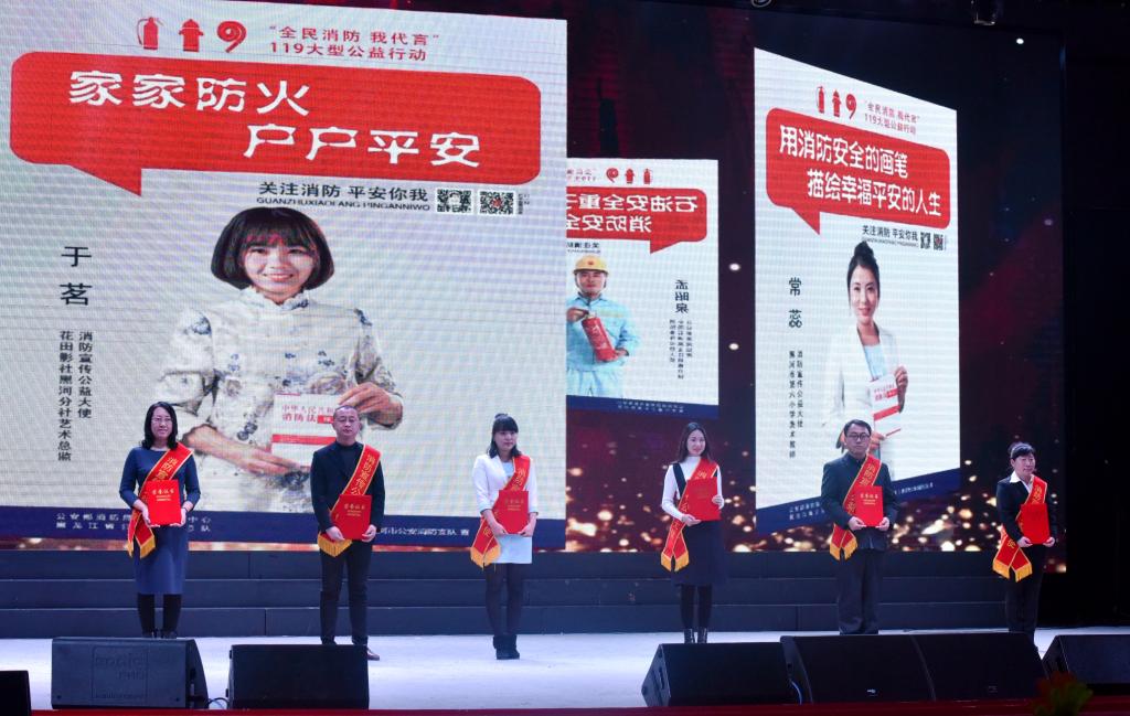 演出期间,黑河市公安消防支队党委为黑河市公安消防支队消防宣传公益大使颁发聘书。