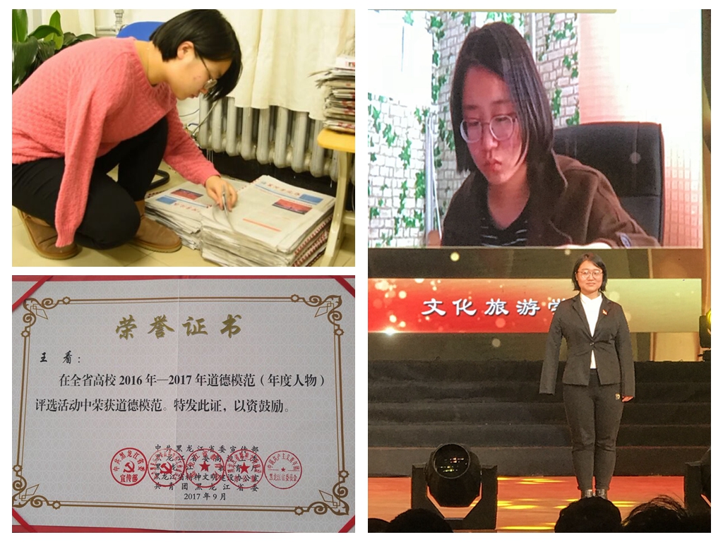 半是鼓励,半是鞭策,王看牢牢记住了父亲的话。也许是天性开朗乐观,也许是当时年纪尚轻,她终于一步步从阴霾中走了出来。王看说自己成绩并不是特别拔尖的类型,但她十分珍惜在校园里学习的机会,为了自己的目标努力着,奋斗着,希望自己能在走出校门的那一刻从容地回眸一笑。2015年,王看以全校第四名的成绩从望奎二中考到了黑河学院,她终于没有辜负家人、老师、同学们的期望,成就了自己的大学梦想。
