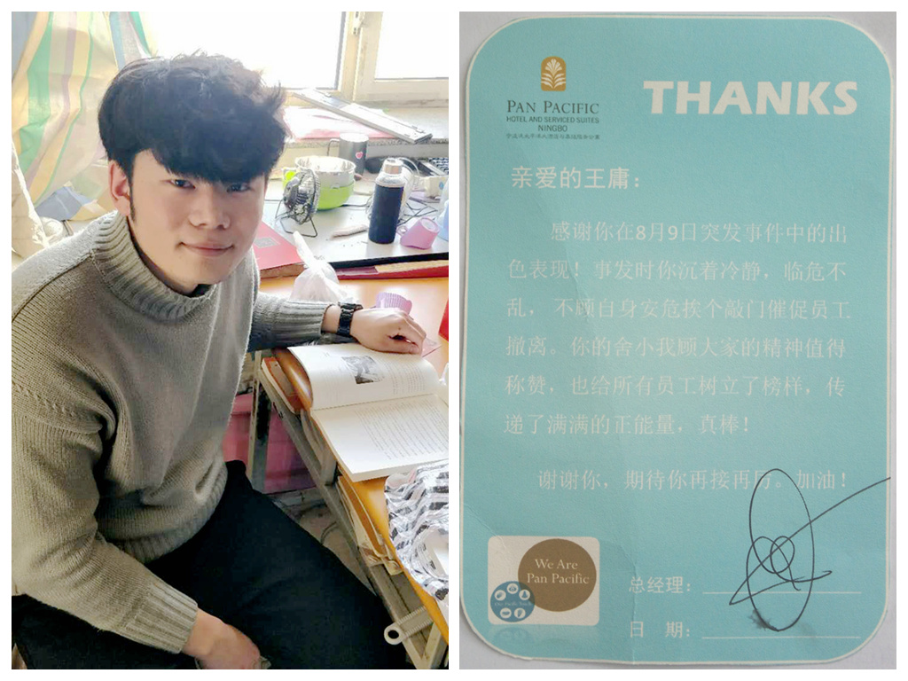 “那天已经很晚了,当时也没有想太多,就想着千万别让火灾造成更大的损失,”王庸回忆道。大火扑灭后,宁波泛太平洋酒店总经理为感谢王庸的英勇表现,特为他颁发感谢信及现金奖励,并向王庸拋出“橄榄枝”,希望他毕业后留在酒店工作。面对大家的赞扬和感谢,王庸笑了笑便离开了,回到工作岗位,和往常一样继续工作。