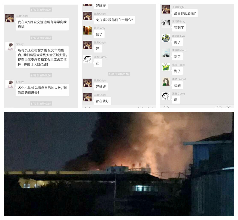8月9日凌晨,在宁波太平洋酒店实习的王庸像往常一样下了晚班回到员工宿舍,正准备休息时突然看到窗外距离员工宿舍不到200米的地方黑烟滚滚。王庸还没回过神来,震耳的爆炸声已经接二连三的响起,随之而来的还有飞溅的爆炸物,此时的王庸才意识到“不好,酒店旁边的工厂着火了。”