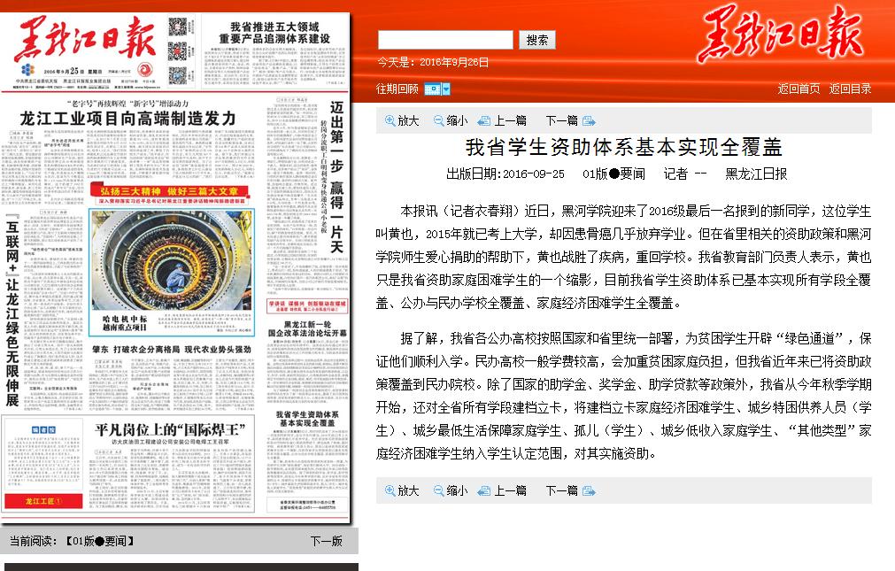 黑龙江日报:我省学生资助体系基本实现全覆盖