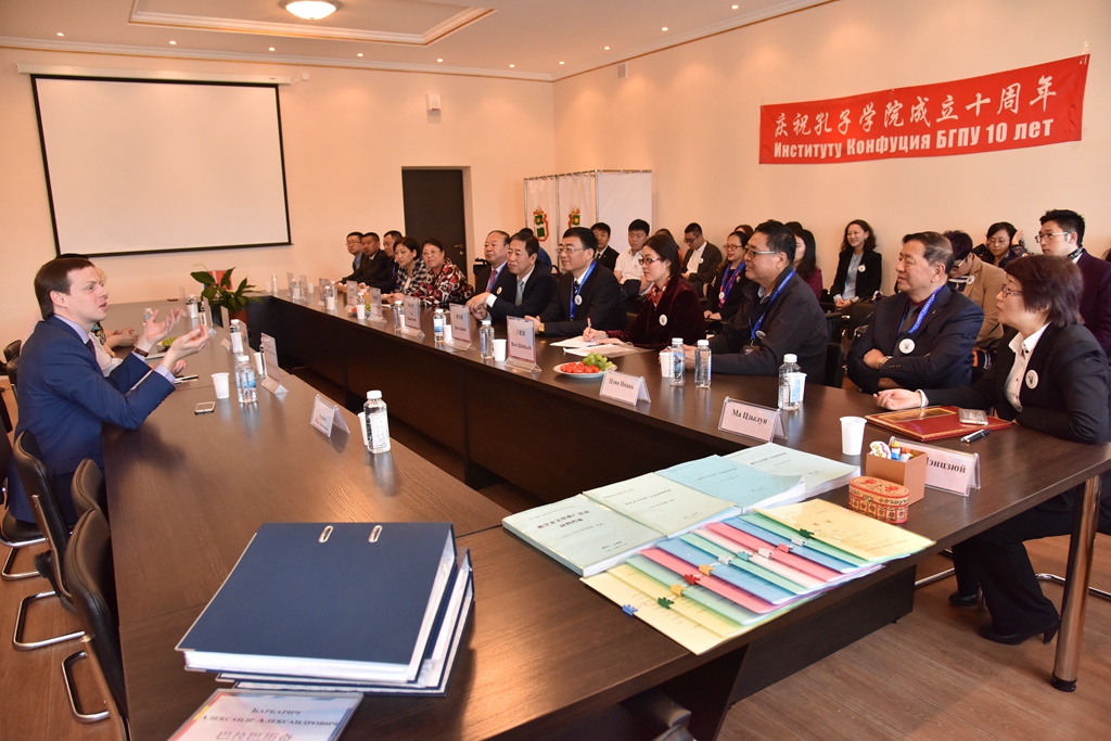 布拉戈维申斯克国立师范大学校长维拉·维塔丽耶夫娜·肖金娜、副校长波波娃·玛丽娜·尤里耶夫娜,国际交流合作处处长、现任孔子学院院长古哈连科·尼古拉·弗拉基米尔洛维奇,中国驻哈巴罗夫斯克总领事郭志军,黑河学院党委书记曹百瑛,原党委书记姜义男、曲伟建,原校长马子龙,历任中方院长、曾经任教的教师应邀与千余名中俄师生共同参加了“友谊桥”剪彩、“孔子思想”摄影展、种植友谊树、“孔子”文化休闲凉亭揭牌仪式、孔子学院成立十周年庆典演出等活动。
