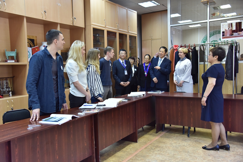 在孔子学院课堂,中国驻哈巴罗夫斯克总领事郭志军、黑河学院党委书记曹百瑛与师生亲切交流。布拉戈维申斯克国立师范大学孔子学院学员可心说,她喜欢学习汉语,热爱中国文化,希望有机会到中国继续进修学习,未来能够从事与中国相关的事业。