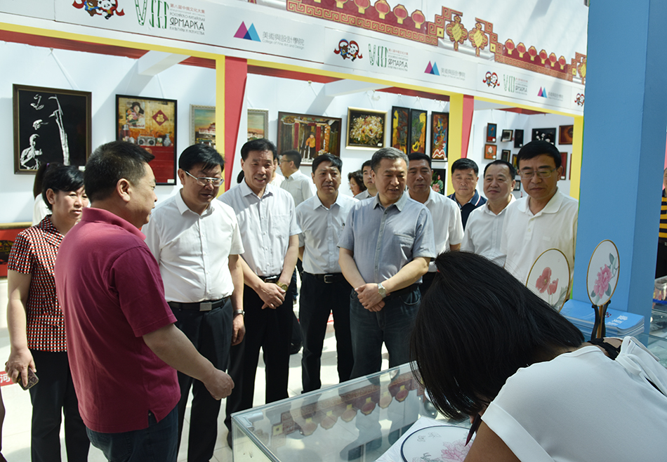市委书记秦恩亭,市委副书记、市长谢宝禄一行走进每个展区,在学生创作的油画、国画、水彩画、漆画、书法、篆刻、陶艺、布艺纤维作品前都认真观赏,并与师生亲切交谈,询问工作学习情况,了解创作理念和创作技巧,鼓励师生立足黑河文化资源优势,创作出更多既有时代特征又有地域特点的优秀作品,让优秀的本土艺术作品走向市场,走进企事业单位,走进千家万户。