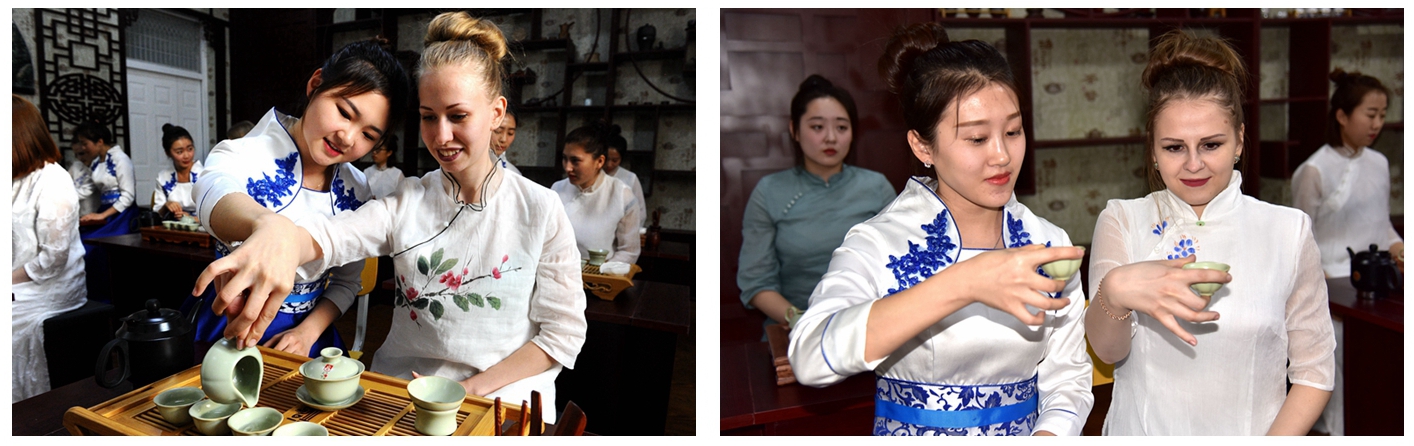 在文化旅游学院的茶文化实训中心,茶艺老师现场为留学生讲授习茶的相关知识。对茶文化有了初步了解后,留学生们接受茶艺社员的邀请,共同参与了洗茶、泡茶、倒茶、奉茶等体验,零距离接触茶道全流程。