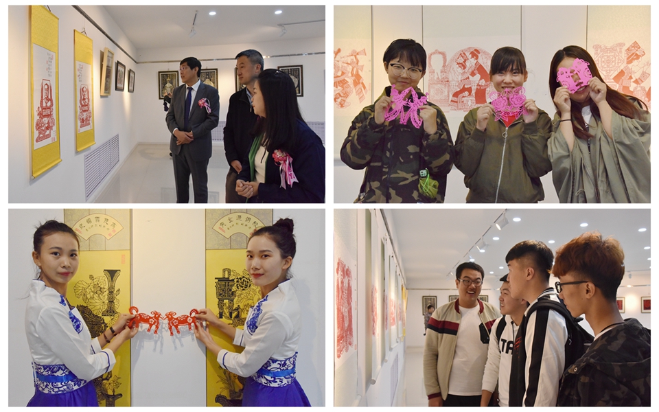 本网讯(记者 赵宇 关月 摄影 魏辉辉)9月24日,由哈尔滨师范大学主办,黑龙江省文学艺术界联合会、黑龙江省美术家协会协办,黑河学院承办的国家艺术基金项目——黑龙江流域多民族剪纸贴画作品巡回展(黑河站)在我校美术楼展厅拉开帷幕。学校副校长张焕强,哈尔滨师范大学招生工作处处长、项目主持人朱建峰,美术学院美教系副教授闫海涛,学生工作部副部长徐琳,美术学院教授王龙,黑龙江省海伦市剪纸传承人徐春风、赵红玉,我校党委(校长)办公室、宣传统战部、学生工作部、美术与设计学院、教育科学学院相关负责人与百余名师生共同参加开幕式。开幕式由美术与设计学院院长戚锋主持。